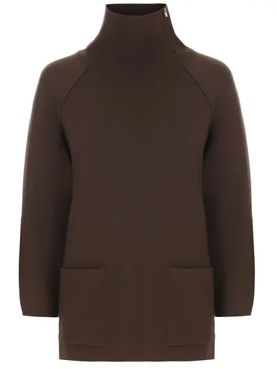 -Коричневый свитер из мягкой шерсти от GRAN SASSO. -Модель свободного силуэта с укороченными рукавами-реглан длины 3/4, накладными карманами, высоким воротником на потайной молнии, с помощью которой можно сформировать отворот.
