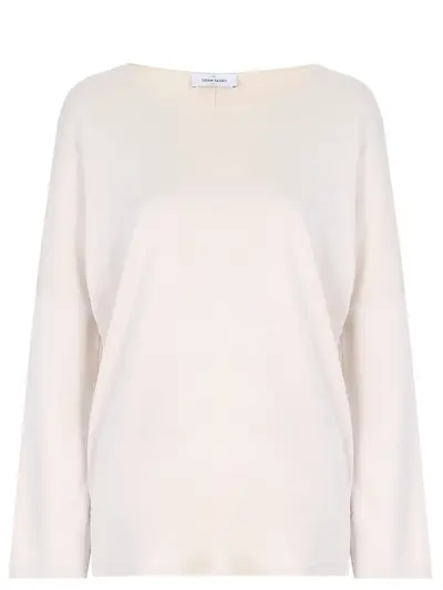 -Кремовый джемпер из тонкой смесовой вискозы от GRAN SASSO. -Модель свободного силуэта со спущенной линией плеча, длинными рукавами и круглым вырезом горловины.