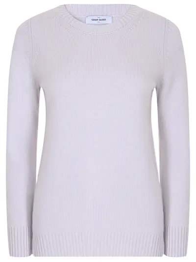 -Серый вязаный джемпер из смесовой шерсти от GRAN SASSO. -Базовая модель полуприлегающего силуэта с длинными рукавами, рельефными манжетами, поясом и отделкой круглого выреза горловины.