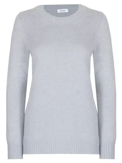 -Серый вязаный джемпер из смесовой шерсти от GRAN SASSO. -Базовая модель полуприлегающего силуэта с длинными рукавами, рельефными манжетами, поясом и отделкой круглого выреза горловины.
