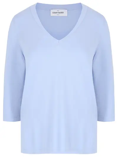 -Голубой пуловер из смесовой вискозы от GRAN SASSO. -Модель полуприлегающего силуэта с укороченными рукавами длины 3/4 и V-образным вырезом на груди будет органично выглядеть как с джинсами, так и с базовыми брюками и пиджаком спокойных оттенков.