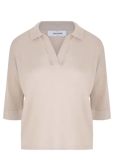 -Модель свободного силуэта, стилизованная под поло, с рукавами длины 1/2, отложным воротником, глубоким V-образным вырезом на груди и декоративными сетчатыми вставками.