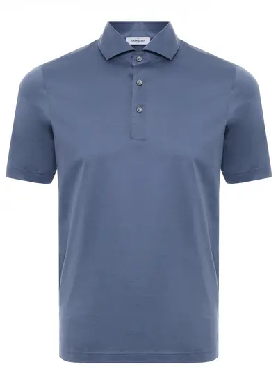 -Синее поло из хлопка от GRAN SASSO. -Модель прямого кроя с короткими рукавами, отложным воротником, застежкой на пуговицы на груди. -Поло дополнит повседневные образы с джинсами, шортами или брюками.