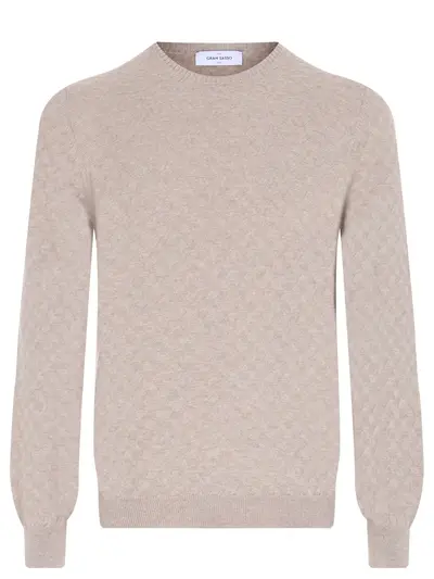 -Лаконичный джемпер бежевого цвета от GRAN SASSO. -Модель выполнили фактурной узорной вязкой из шерстяной пряжи. -Круглый вырез горловины, длинные рукава, эластичные рельефные манжеты и пояс.
