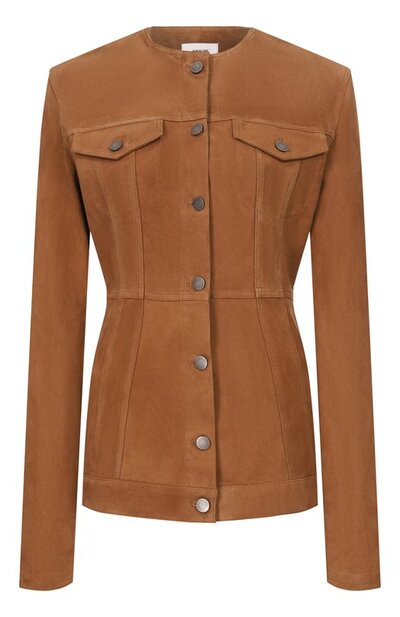 Замшевую куртку с круглой горловиной и патами внизу дополнили нагрудными карманами с клапанами. Приталенная модель застегивается брендированными металлическими болтами.