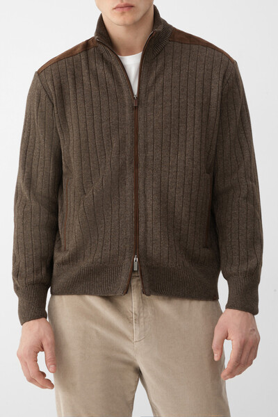 Кардиган Paul&Shark на встречной молнии с двумя брендированными пуллерами. Изделие выполнено из мягкой шерсти, кашемира и прочного вискозного волокна коричневого оттенка. Модель прямого силуэта украшают детали-отделка из бархатистой замши и фактурный геометрический узор в виде вертикальных полос в тон основе.