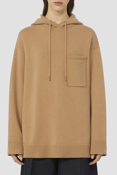 Худи чулочной вязки от Max Mara. Для изготовления прямой модели выбрана комбинация из мягкой шерсти и кашемира в оттенке кэмел. Изделие отличается спущенной линией плечевого шва и наличием глубокого капюшона на завязках, надёжно защищающего от порывов ветра, и минималистичного декора: детали с тиснёным логотипом бренда спереди.