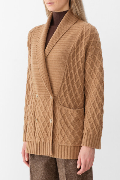 Двубортный кардиган Max Mara в оттенке кэмел. Изделие удобного кроя с прямыми линиями изготовлено из чистой верблюжьей шерсти и украшено фактурным геометрическим узором в виде ромбов тон. Конструкция модели отличается наличием широкого шалевого воротника и двух крупных накладных карманов, расположенных по бокам. Дизайн кардигана завершается глубоким V-образным вырезом горловины и застёжкой на четыре роговые пуговицы.
