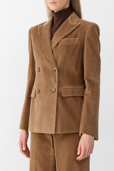 Двубортный блейзер Max Mara с центральной шлицей в задней части. Для пошива изделия прилегающего и немного расклешенного книзу женственного фасона используется бархатистый хлопковый вельвет. Модель орехового оттенка застёгивается на четыре крупные роговые пуговицы и выглядит органично в тандеме с брюками с классическими стрелками из той же коллекции.