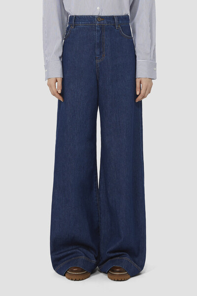Синие джинсы Max Mara с прострочкой на швах. Для производства модели широкого силуэта используется чистый хлопковый деним с эффектом делаве. Изделие характеризуется традиционным фасоном с пятью карманами и наличием неброского декора: светло-коричневых кожаных патча с тиснёными логотипом и надписью-названием линейки одежды и детали с изображением бабочки на спинке. Строчка по нижнему краю джинсов подчёркивает выверенный крой.
