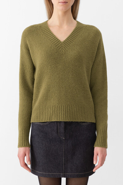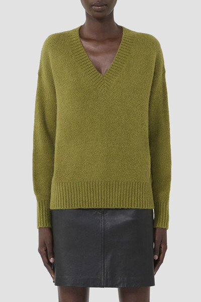 Оливковый джемпер чулочной вязки от Max Mara. Для создания изделия широкого кроя используется смесь мягкой пряжи альпаки, хлопка, прочного эластичного нейлона и модала. Широкий пояс и манжеты длинных рукавов оформлены резинкой для оптимальной посадки по фигуре.