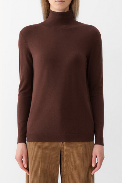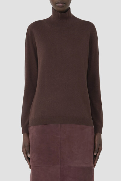 Трикотажный свитер Max Mara расслабленного силуэта с добавлением стрейчевых волокон. Для создания изделия с высоким воротником-стойкой используются мягкая шерсть, прочный нейлон и гладкий шёлк. Создайте выигрышный комплект, сочетая между собой свитер, однобортный блейзер в мужском стиле и брюки с плотным поясом со шлевками под ремень.