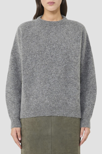 Серый джемпер Max Mara с традиционным круглым вырезом горловины на резинке. Изделие выполнено из комбинации пряжи альпаки, шерсти и прочного эластичного нейлона. Конструкция модели средней длины характеризуется широким объёмным фасоном и спущенной линией плечевого шва.