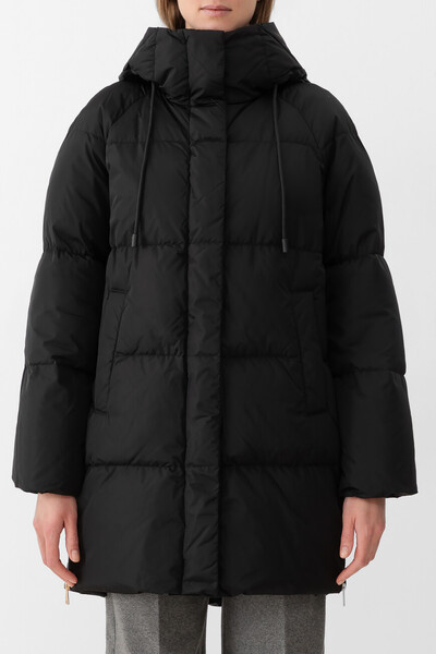 Парка миди от Max Mara с глубокими боковыми разрезами на молнии. Для пошива изделия чёрного цвета выбран прочный стёганый нейлон - водоотталкивающая тафта с матовой текстурой. Фасон повседневной модели характеризуется слегка расклешенным книзу кроем и наличием высокого воротника-стойки, переходящего в капюшон на кулиске, надёжно защищающих от порывов ветра. Тепло обеспечивает наполнитель из натурального гусиного пуха и пера.