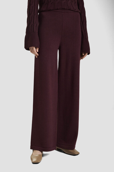 Брюки Max Mara вишнёвого оттенка с высокой линией талии. Изделие прямого, немного расклешенного книзу силуэта связано из мягкой шерсти лицевой гладью. Тёплая модель отличается минималистичным дизайном без броского декора и наличием плотного широкого пояса со скрытой резинкой.