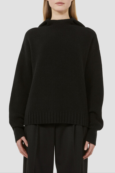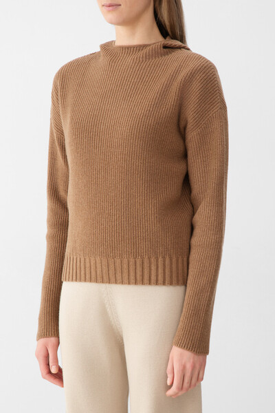 Свитер прямого силуэта от Max Mara чулочной вязки. Для производства изделия с невысоким дизайнерским воротником-стойкой выбрана комбинация из мягкой шерсти и кашемира. Широкий пояс оформлен резинкой, обеспечивающей более комфортную посадку модели по фигуре.