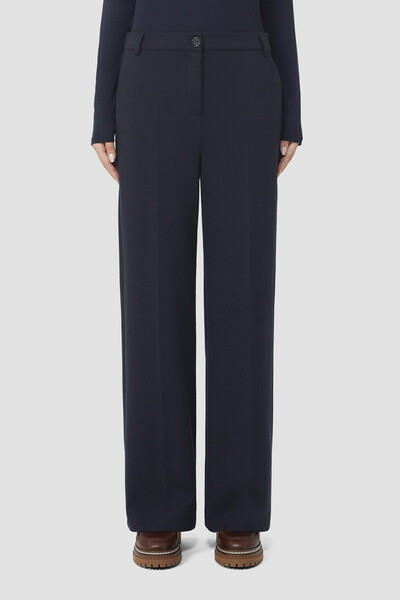 Тёмно-синие брюки Max Mara с классическими стрелками. Изделие выполнено из эластичной фланели на основе хлопка и полиэстера с характерной текстурой. Лёгкая модель длиной до щиколотки застёгивается на молнию, покрытую планкой, и крупную тональную пуговицу. Брюки легко сочетать с вязаным свитером, рубашкой или блейзером.