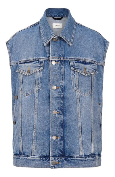 Oversize-жилет Janette из выбеленного хлопкового денима дополнили двумя рядами пуговиц. Помимо нагрудных карманов предусмотрели боковые, а на поясе разместили регулируемые паты. Принадлежность модели бренду подчеркнули фирменным патчем справа.