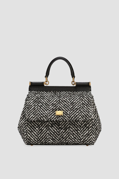 Сумка Dolce & Gabbana Sicily - символ элегантности и традиций Дома. Для создания аксессуара среднего формата используется твид на основе мягкой вирджинской шерсти, пряжи альпаки, шёлка, прочного полиэфира и нейлона с чёрно-белым шевронным узором. Отличительными деталями являются чёрные вставки-отделка из гладкой телячьей кожи. Модель идеально подходит для любого случая и сочетает в себе вневременной стиль и функциональность.