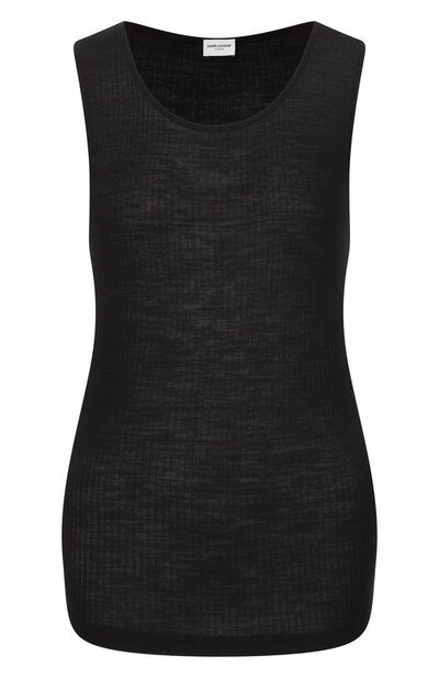 Для изготовления майки с круглой горловиной использовали ребристый шерстяной трикотаж. Спереди модель украсили вышитой фирменной монограммой Кассандра.