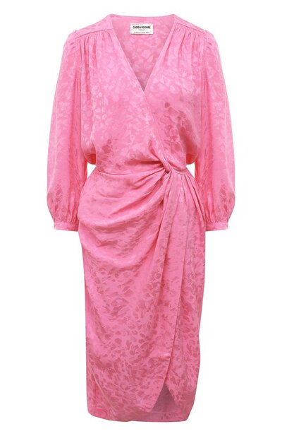 Платье длиной чуть ниже колен выполнили из тонкой шелковой ткани насыщенного розового цвета (в марке его назвали Tulip). Переплетение гладких длинных нитей в этом нежном текстиле сформировало жаккардовый орнамент, который напоминает окрас леопарда. Эффект от такого сияющего рисунка усилили, заложив множество мелких складок вдоль талии, плечевых швов и манжет.