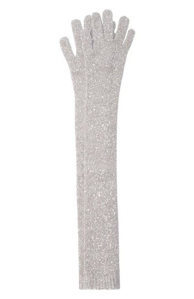 Перчатки длиной выше локтя выполнили из ворсистого трикотажа Dazzling на основе нейлона, полиэстера и мохера. Модель с манжетой в рубчик украсили микропайетками.