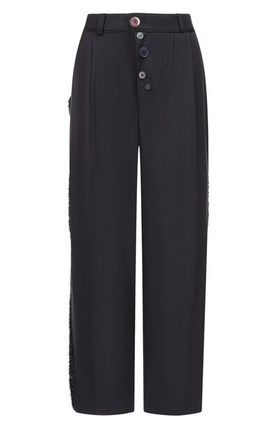 Укороченные брюки с парными складками спереди и тремя карманами выполнили из костюмной шерсти в едва заметную жаккардовую полоску. Модель с атласной отделкой и цветными разноразмерными пуговицами декорировали фактурными мерцающими лампасами, этикеткой в боковом шве и брендированным патчем сзади.