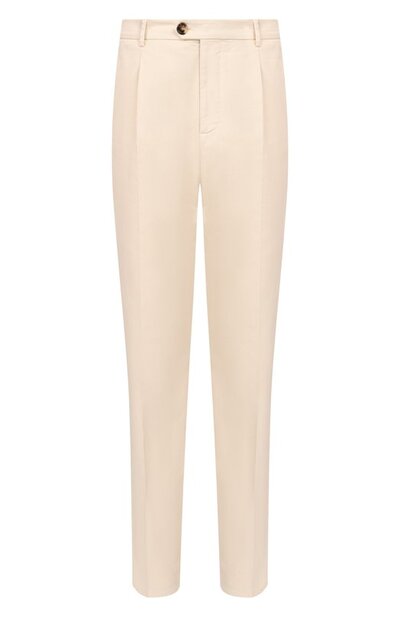 Слегка зауженные брюки с защипами сшили из эластичного габардина на основе хлопка American Pima. Модель с боковыми и задними прорезными карманами окрасили в готовом виде.