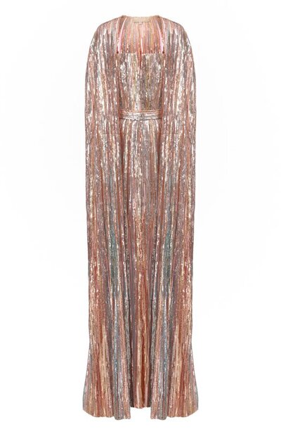 Корсетное платье-бюстье с фигурным декольте выполнили из тюля на основе шелка и полиэстера, полностью расшитого пайетками. Из такого же материала выполнили и свободную накидку.