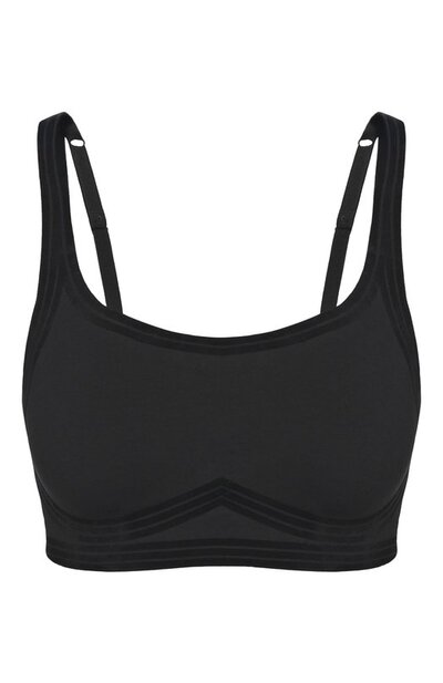 Бра-топ выполнили по технологии 3W из двухслойного стрейчевого трикотажа на основе хлопка. Бесшовная модель с регулируемыми бретелями и рельефными силиконовыми полосками, создающими поддержку груди, застегивается потайными крючками на поясе сзади.