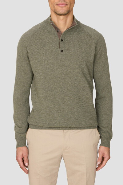Кашемировый свитер прямого силуэта от Zilli. Фасон повседневной модели характеризуется наличием воротника-стойки с застёжкой на четыре брендированные пуговицы. Характерными особенностями изделия являются вязка лицевой гладью на длинных рукавах и фактурный геометрический узор спереди и на спинке в тон. Внутренняя сторона планки застёжки интересна отделкой из мягкой замши с бархатистой текстурой.
