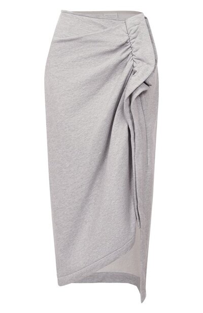 Для пошива асимметричной миди-юбки с драпировками и волнистой оборкой использовали плотный хлопковый трикотаж. Эластичная модель застегивается потайной молнией сбоку.