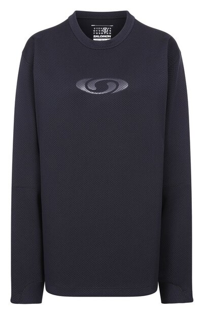 Лонгслив свободного кроя, созданный в коллаборации с Salomon, выполнили из полиэстерового трикотажа с сетчатой фактурой. Спереди модель декорировали эмблемой спортивной марки, а на спинке – фирменной белой строчкой и числовым кодом.