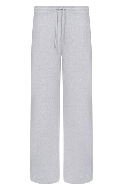 Брюки прямого кроя сшили из хлопкового трикотажа. Эластичную модель с широким поясом-кулиской дополнили задним накладным и боковыми врезными карманами.
