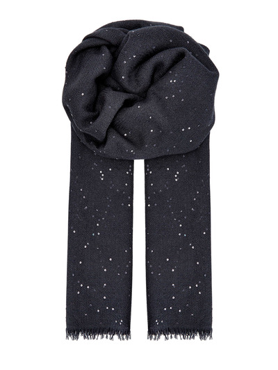 Минималистичный женский палантин от Brunello Cucinelli создан из кашемира и шелка Diamante в приглушенном пепельном оттенке. Оптимальная толщина нитей образует легкую и мягкую фактуру, благодаря свойствам натурального материала ткань является легкой и теплой одновременно. Фирменную элегантность в образ вносят вплетенные полупрозрачные пайетки. Сделано в Италии.