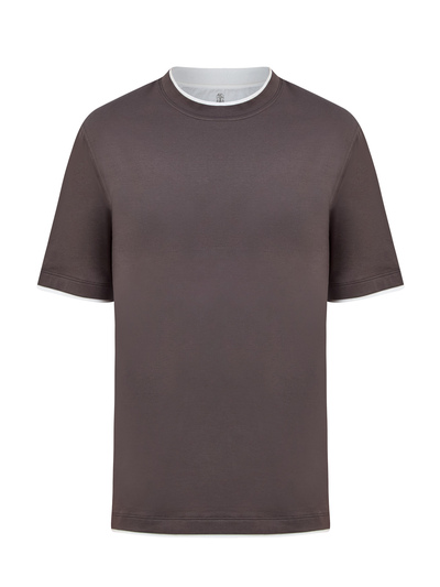 Минималистичная мужская футболка от Brunello Cucinelli выполнена из мягкого джерси в коричневом оттенке — однородные волокна собранного вручную хлопка образуют гладкую фактуру ткани. Двойная контрастная окантовка кромок подчеркивает расслабленный стиль изделия. Детали: короткие рукава, прямой нижний край, круглый вырез горловины. Сделано в Италии.