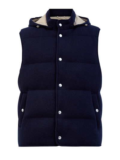 Вязаный мужской жилет от Eleventy выполнен в темно-синем оттенке из шерстяной и кашемировой пряжи. Внутренний наполнитель из пуха надежно защищает от низких температур. Практичный дизайн дополнен регулируемым съемным капюшоном на молнии и подкладкой из влагозащитного нейлона. для защиты от ветра. Детали: воротник-стойка, застежка на кнопки, прорезные карманы, потайной внутренний карман.