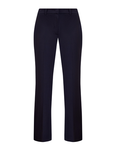 Костюмные брюки от Lorena Antoniazzi созданы из гладкой итальянской шерсти в оттенке ночного неба. Эластичные волокна в составе препятствуют износу и образованию складок, слегка расклешенный крой и узор в тонкую вертикальную полоску подчеркивают элегантный силуэт. Фирменный штрих — символика бренда на спинке. Детали: заложенные стрелки, прорезные карманы, шлевки для ремня. Сделано в Италии.