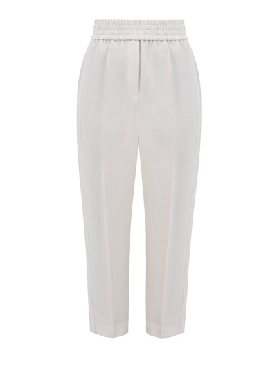 Минималистичные брюки из коллекции Brunello Cucinelli созданы из гладкой ткани на основе волокон вискозы и льна. Однотонное исполнение и лаконичный дизайн делают модель универсальным дополнением расслабленных образов. Широкий эластичный пояс обеспечивает комфортную посадку по фигуре. Детали: прорезные карманы, укороченный крой. Сделано в Италии.