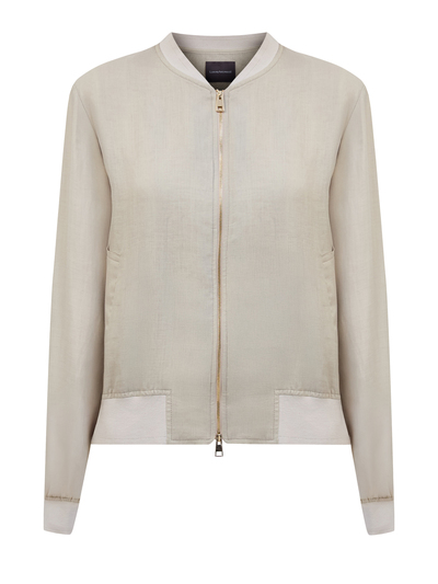 Легкая женская ветровка-бомбер от Lorena Antoniazzi станут идеальным решением для летнего сезона. Модель создана из тонкого крапивного волокна рами, полностью натуральный состав обеспечивает максимальный комфорт в летний сезон. Изделие свободного кроя с трикотажной отделкой кромок, прорезными карманами и символикой на спинке. Сделано в Италии.