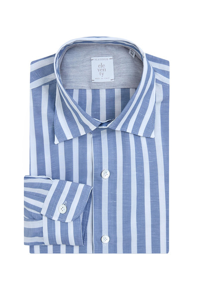 Мужская рубашка из коллекции Platinum от Eleventy. Для создания модели был выбран тонкий натуральный хлопок с добавлением волокон льна. Эластичная и дышащая ткань обеспечивает максимальный комфорт в движении. Минималистичный принт в вертикальную полоску и французский воротник придают образу расслабленное настроение. Детали: застежки на пуговицы из перламутра, приталенный крой с вытачками, закругленные нижние кромки. Сделано в Италии.