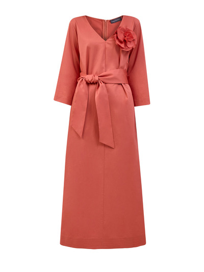 Элегантное платье-миди от Lorena Antoniazzi выполнено из гладкого хлопка, невысокий процент эластичных волокон в составе облегчают уход за изделием. Свободный крой, широкий пояс в тон и прорезные карманы придают изделию черты неформального шика, а объемная брошь в виде цветка вносит в образ женственный акцент. Детали: рукава 3/4, V-образный вырез горловины, застежка на молнию на спинке. Сделано в Италии.