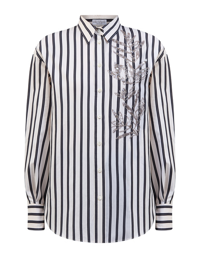 Элегантная рубашка от Brunello Cucinelli предлагает свежий взгляд на классический рубашечный мотив. Модель создана из гладкого поплина на основе хлопка и шелка, и дополнена полоской Regimental в мужском стиле и цветочным узором Flora, вышитым серебряной нитью и пайетками. Крой отличается достаточно свободными формами с широкими рукавами. Сделано в Италии.