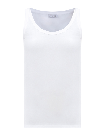 Базовый топ в белом цвете от Brunello Cucinelli идеально подходит для создания самостоятельных или многослойных образов. Модель из хлопкового джерси в тонкий рубчик дополнена блестящей цепочкой Мониль на спинке, которая подчеркивает присущий бренду изысканный стиль. Детали: изделие без рукавов, круглый вырез горловины. Сделано в Италии.