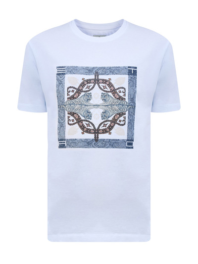 Мужская футболка прямого кроя от Etro создана из хлопкового джерси — дышащей ткани с мягкой и гладкой фактурой. Изделие в белом цвете дополнено квадратным принтом Tigers с фирменным мотивом пейсли на передней планке. Детали: круглая пройма горловины, короткие рукава, кромки закрыты объемным швом двойной иглой. Сделано в Италии.