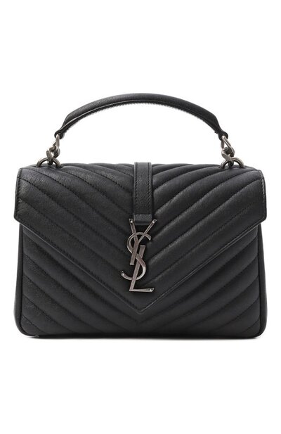 Для создания черной сумки Monogram College использовали овечью кожу. Она мягче и легче обычной, но при этом прочная, а за счет ее фактуры модель выглядит так, словно прослужила не один сезон. Эффект подкрепили монограммой Кассандра. Декор, составленный из инициалов Ива Сен-Лорана, выполнили из металла цвета античного серебра, как и съемный плечевой ремень.