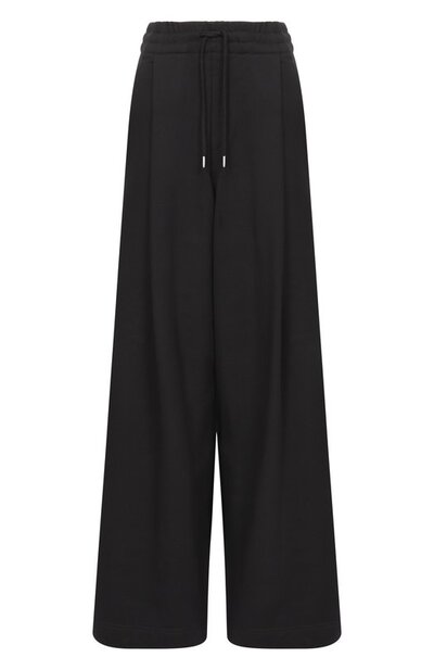 Широкие расклешенные брюки с глубокими складками спереди выполнили из хлопкового трикотажа. Модель с регулируемым поясом-кулиской дополнили врезными боковыми карманами и задним с листочкой.