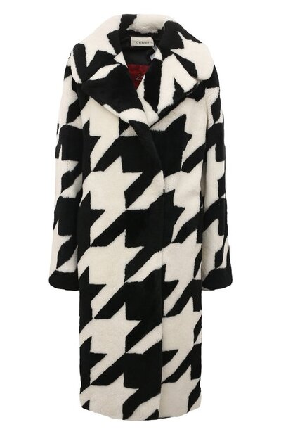 Несмотря на черно-белую гамму эта прямая шуба не выглядит просто. Все дело в крупном мотиве пье-де-пуль, вдохновленном нарядами из архивов 1960-х. Для пошива модели мастера марки, основанной Гуччио Гуччи, использовали мягкую овчину из шкур ягнят после первой стрижки. Тонкая выделка сделала материал легким, поэтому изделие комфортно садится по фигуре и отлично сохранят тепло.