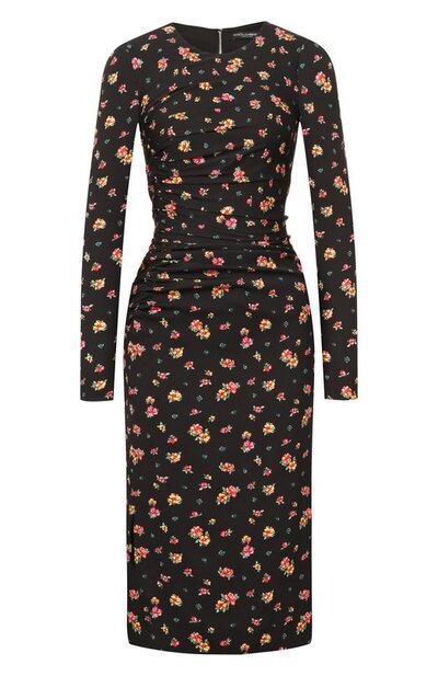 Драпированное миди-платье сшили из эластичного шелка шармез с цветочным мотивом. На подоле предусмотрели разрез, открывающий правую ногу. Модель с неглубоким круглым вырезом застегивается молнией на спинке.