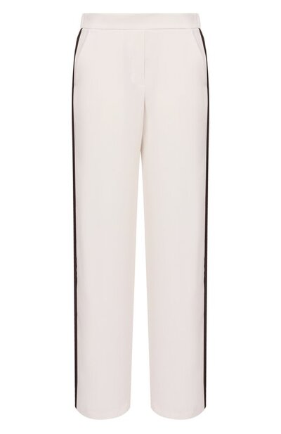 Широкие брюки с вшитой в пояс резинкой выполнили из полиэстера. Модель с широкими контрастными лампасами дополнили врезными боковыми карманами.